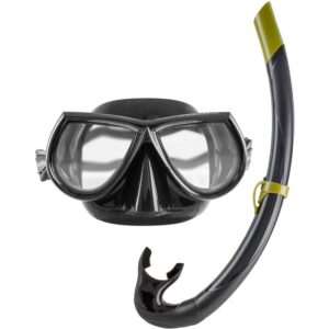 The mask features a large tempered glass lens and a low volume soft silicone skirt. The snorkel has an ergonomic shape and comfortable mouthpiece. The snorkel contours to you face and head reducing vibration and drag during the dive.